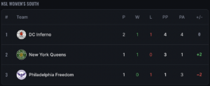 We have an incredible match in store for you. Tomorrow – Friday March 20th, at 6 PM ET, the New York Queens travel to the Arlen Specter Center to take on the Philadelphia Freedom. This might be the most consequential match of the NSL season so far. Let’s take a look at the South Division standings: